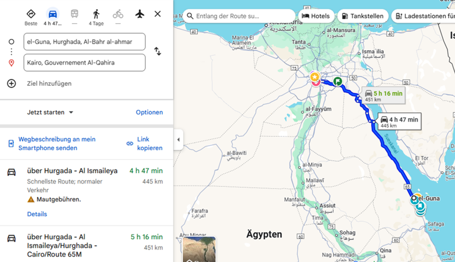 Urlauber, die zum ersten Mal nach Ägypten kommen, unterschätzen oft die Entfernungen. Hier einige Tipps: Ausflüge nach Kairo sind am besten aus el Gouna oder Hurghada. Ab Safaga fährt man statt 5.5 Stunden (470km ab hrg) locker eine Stunde einfach länger. Ausflüge nach Luxor dagegen dauern aus El Gouna eine Stunde länger. Aus Hurghada etwa 4 Stunden. Achtung: Ausländer dürfen nachts nicht durch die Berge fahren. Deshalb können Ausflüge mit Ballonfahrt nur bei einem 2 Tages Trip gebucht werden. Marsa Alam ist etwa 250 km von Hurghada entfernt, Safaga 50 km. Deshalb buchen Gäste aus diesen Regionen besser vor Ort Ausflüge, nicht bei Hurghada ansässigen. Auch Insel Aufenthalte wie Orange Bay, Paradise oder Mahmya machen von dort aus keinen Sinn. So, ich hoffe, ein wenig Orientierung gegeben zu haben. Schönen Sonntag allen!