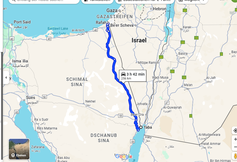 Der Gazastreifen hat in etwa die Größe von Hurghada und der Grenzübergang ist Rafah, am Mittelmeer. Die Entfernung von Sharm el SheiKh zur Grenze sind 450 KM. Der Grenzverlauf zu Palästina sind etwa 15 KM. Die restlichen 430 KM ist die Grenze zu Israel.