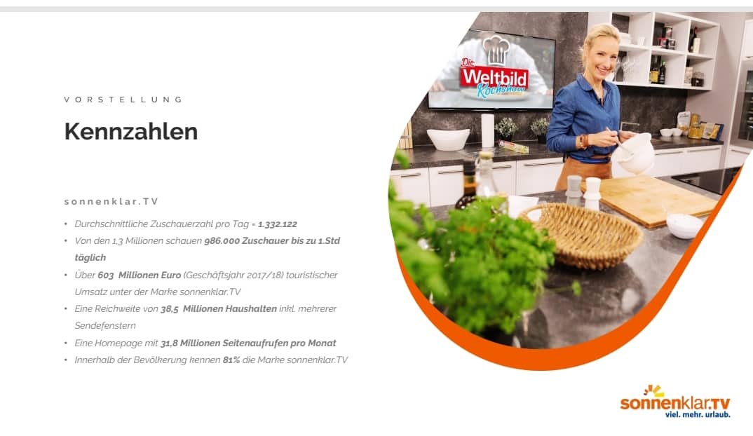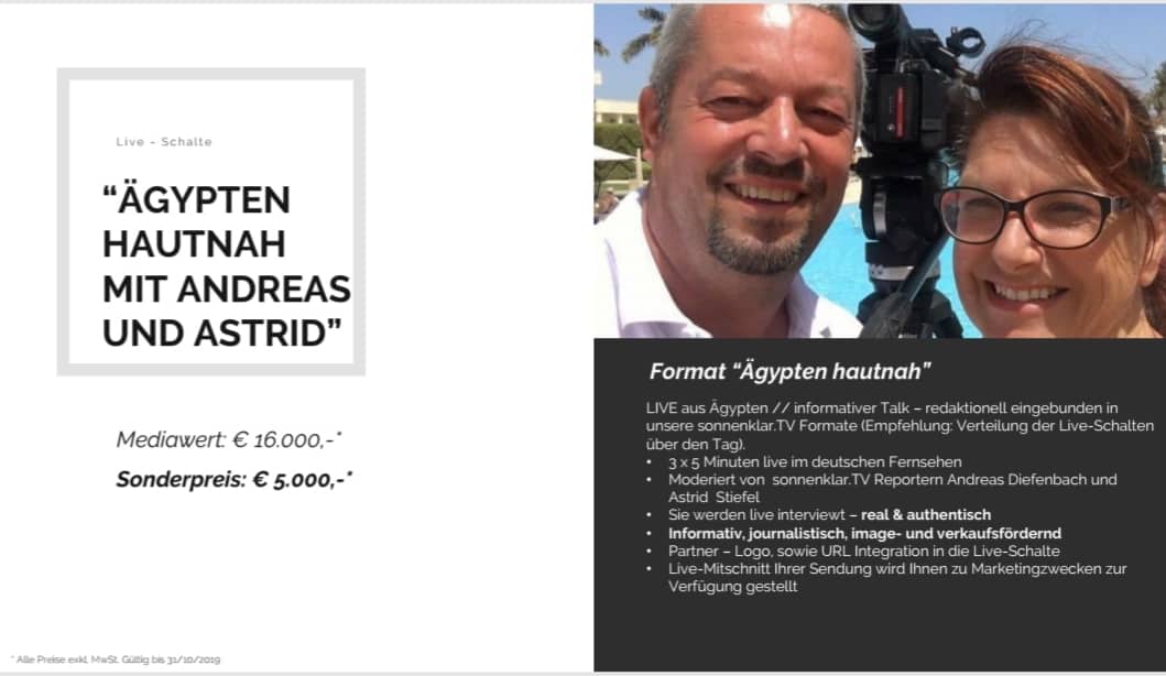 Wer jedoch Werbung über Sonnenklar.TV direkt möchte und zwischen 100.000 und 500.000 Zuschauer live im Fernsehen gleichzeitig erreichen, die alle nur eines möchten: Urlaub machen, die können sich Werbezeit kaufen!